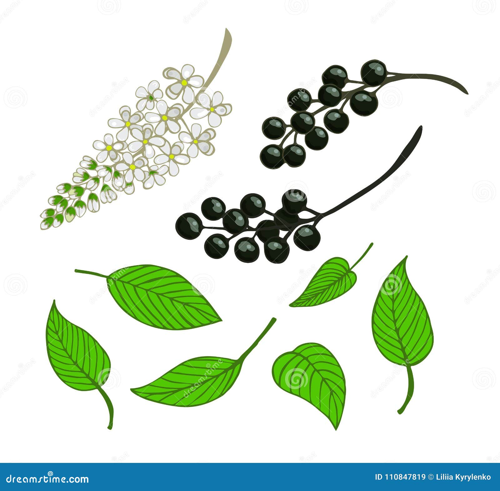 A Set Of Bird Cherry Isolated Berries Flowers And Leaves Of Mayday Tree Stock Illustration Illustration Of Herb Cluster 110847819