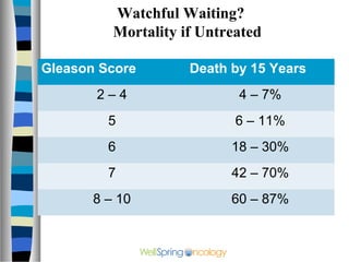 Web Men who are older and have a shorter life expectancy become candidates for active surveillance when they have a Gleason score of 7 intermediate level. The cells look similar to normal prostate cells. 7 percentage of positive biopsies less than 34.